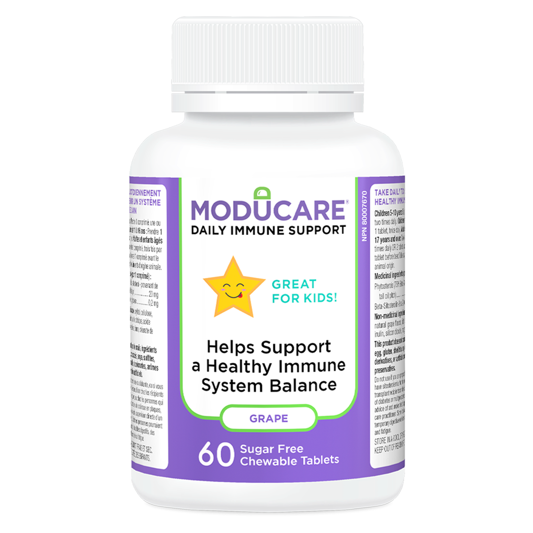 Kids Grape Chewable Moducare® is an excellent source of plant sterols and sterolins. These beneficial plant fats, also known as phytosterols, are found in fruits, vegetables, nuts and seeds. Phytosterols offer immune-enhancing properties and can activate the cells that regulate immunity. Phytosterols also have anti-inflammatory properties and can help lower the release of the stress hormone cortisol. These combined benefits of phytosterols offer significant support to daily immune system health. This chewable dosage form is also suitable for adults who have difficulty swallowing capsules.